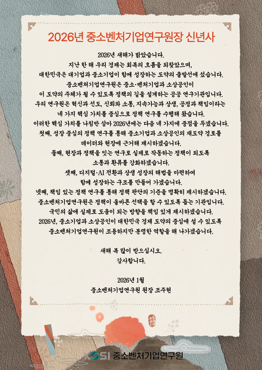 중소벤처기업연구원, 「2026년 중소기업·소상공인 10대 이슈」 포커스 발간...제6차 KOSI 심포지엄 통해 정책 대응 논의